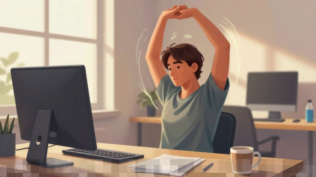 Ketegangan di area leher dan bahu adalah hal yang umum terjadi akibat terlalu lama menatap layar komputer. Salah satu teknik peregangan yang sederhana untuk otot leher adalah dengan memiringkan kepala secara perlahan ke kiri dan kanan, lalu tahan posisi tersebut selama 10 hingga 15 detik di setiap sisi. Gerakan ini membantu meredakan ketegangan yang kerap terjadi pada otot leher. Untuk bahu, angkat kedua bahu ke arah telinga, tahan beberapa detik, lalu lepaskan perlahan. Ulangi gerakan ini beberapa kali untuk mengurangi rasa pegal dan meningkatkan aliran darah di area bahu dan punggung atas.